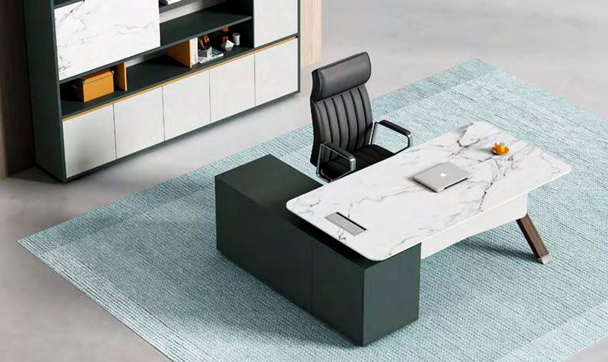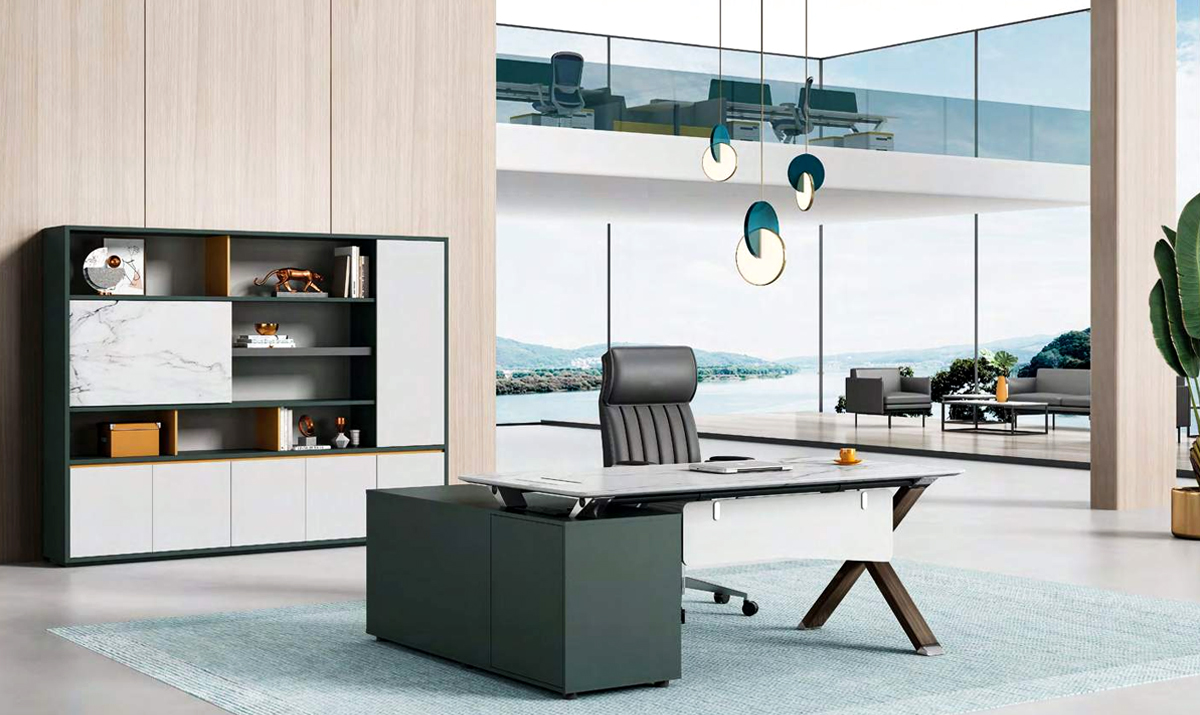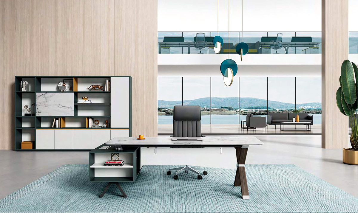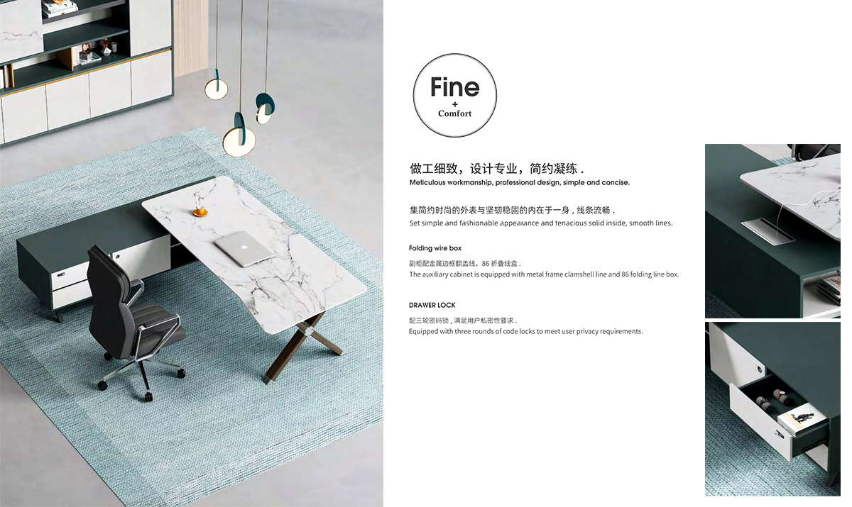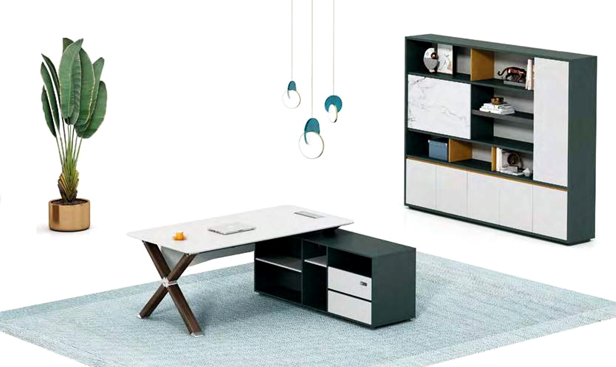 整个行政桌台面板悬空在附台脚上,外观逐层递进挡板造型与台面造型前后呼应,为产品外观形象添加独特的色彩,