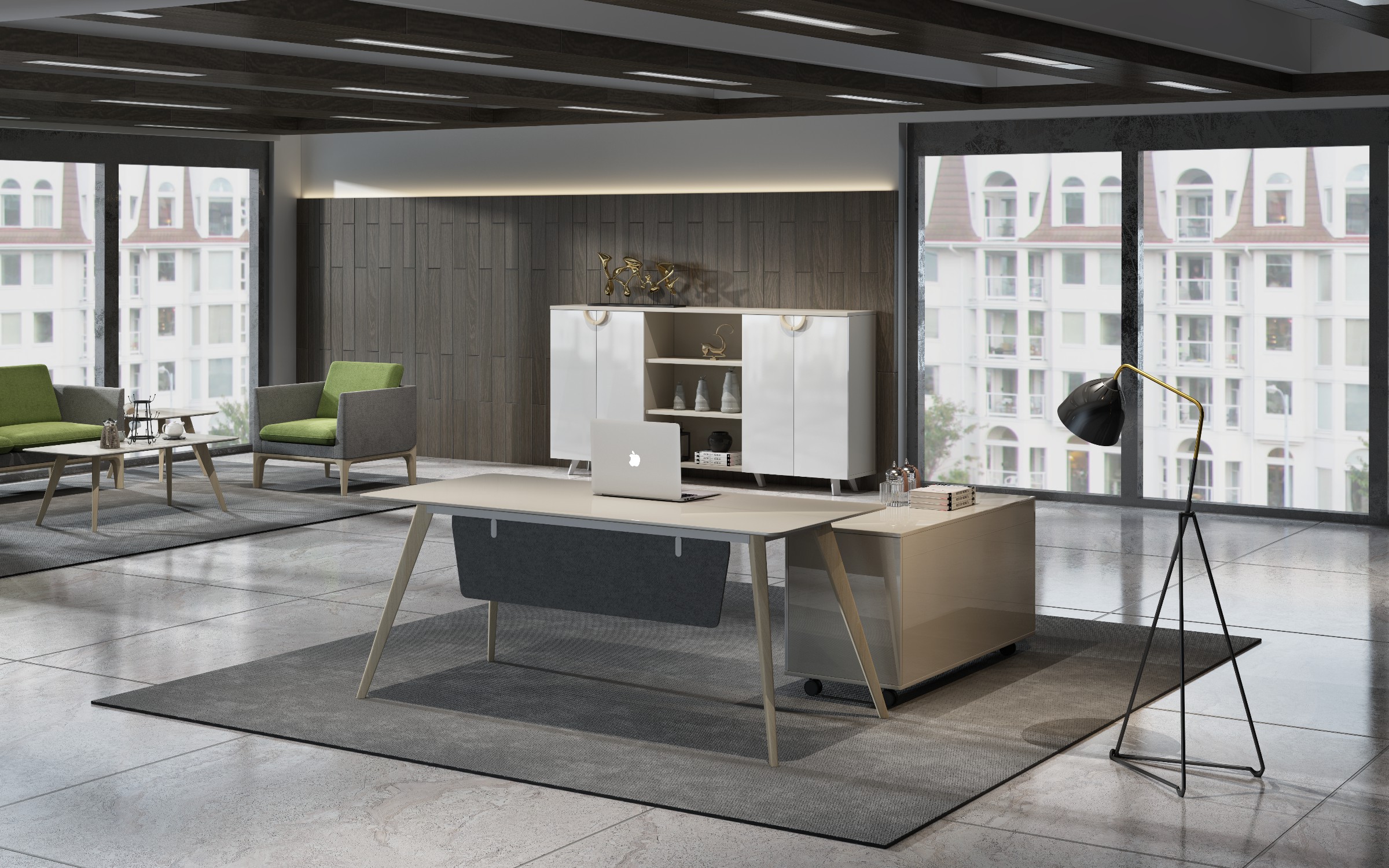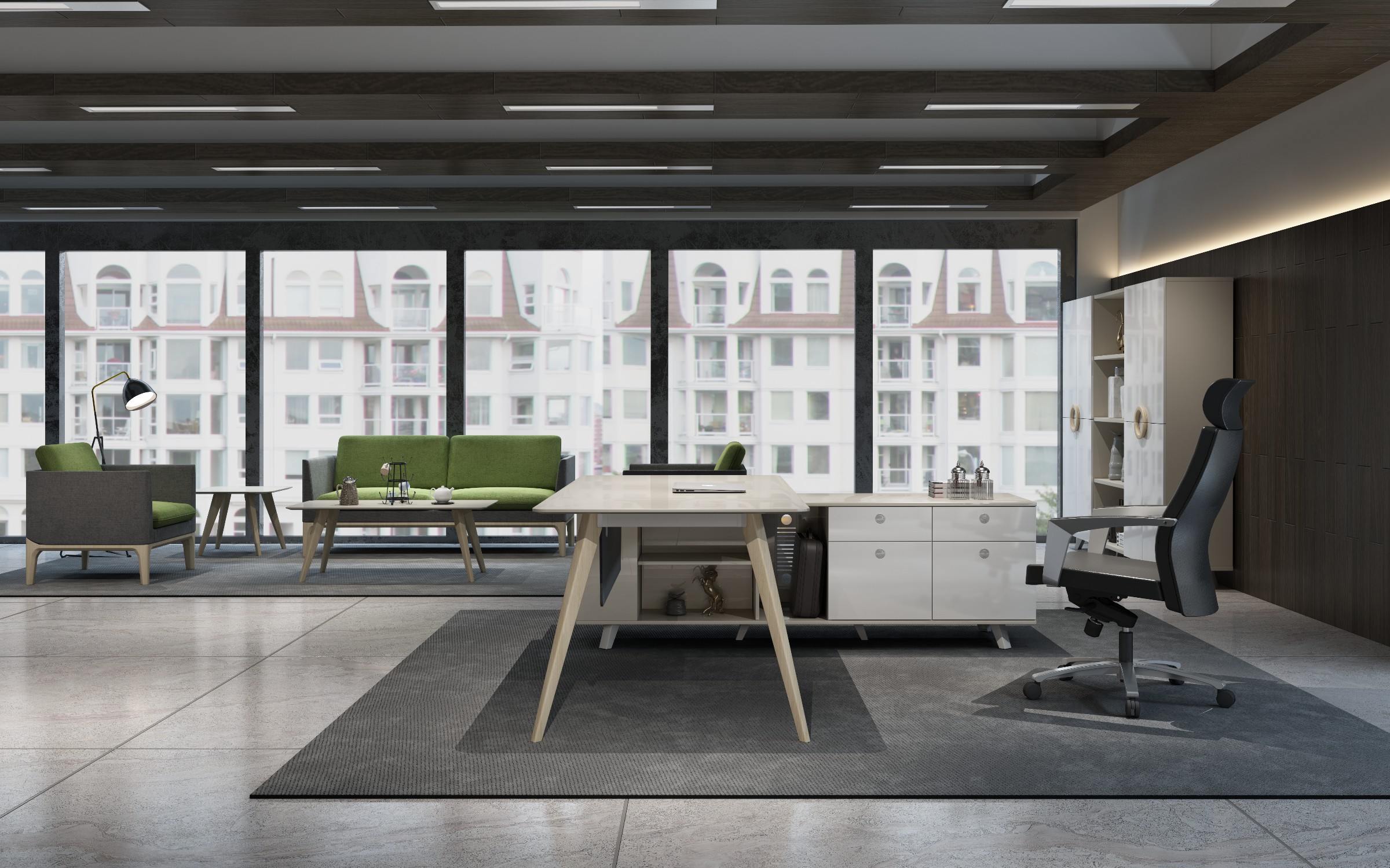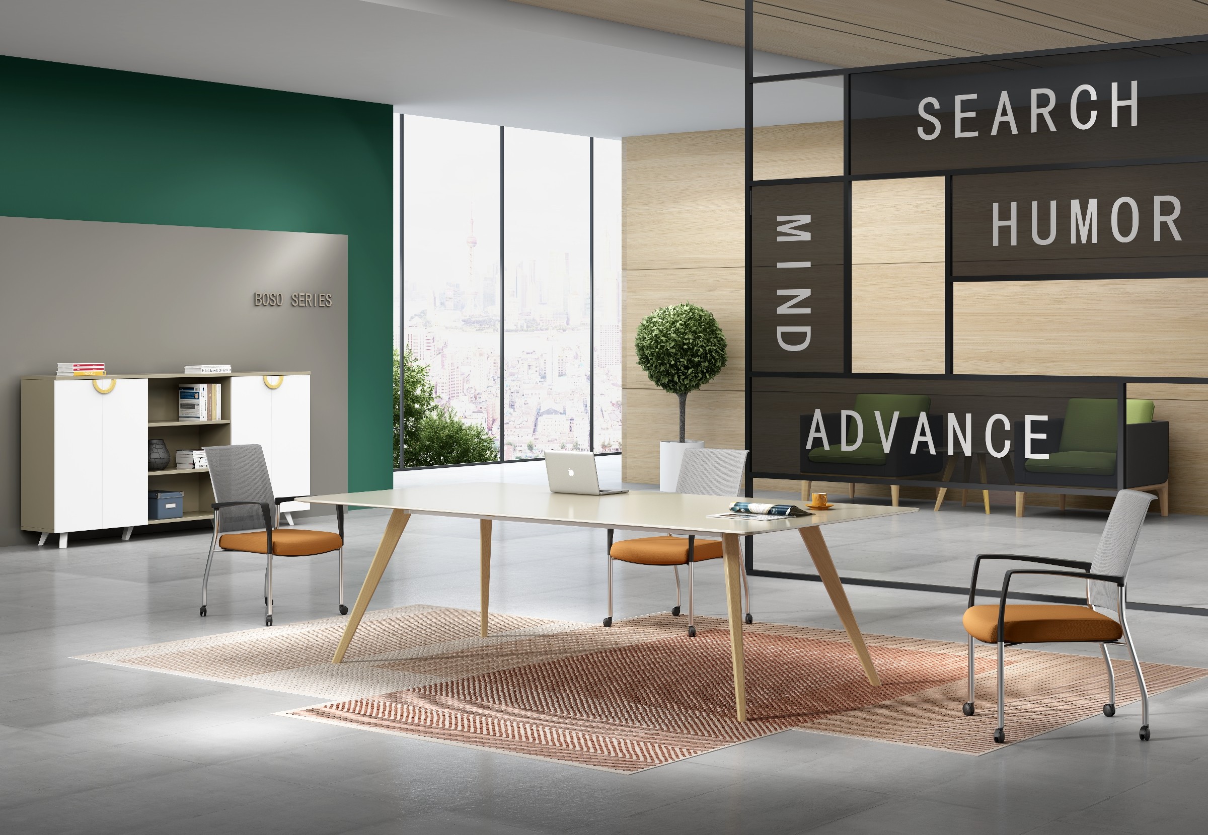 博斯用原木元素,结合浅色亮面的材料,极简的风格,打造轻松愉悦、人与自然相结合的办公环境体验,将木材、石材的原始质感完美结合到办公家具上,颇具北欧风情。